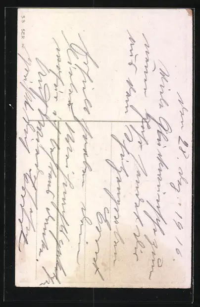 Personenbezogene Daten auf der Rückseite der Karte wurden durch blauen Textmarker unkenntlich gemacht. Die blauen Stellen sind auf die Vorderseite durchgeweicht und wirken sich negativ auf das Postkartenfoto aus