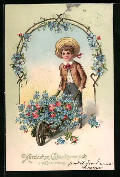 AK Junge mit Strohhut schiebt Karre voller Vergissmeinnicht