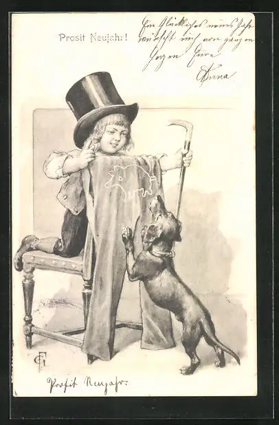 AK Junge mit Zylinder spielt mit seinem Dackel, Prosit Neujahr!