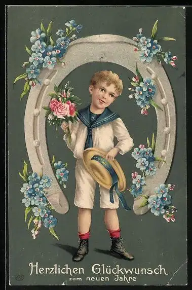 AK Junge mit einem Rosenstrauss, Hufeisen mit Vergissmeinnicht, Neujahr