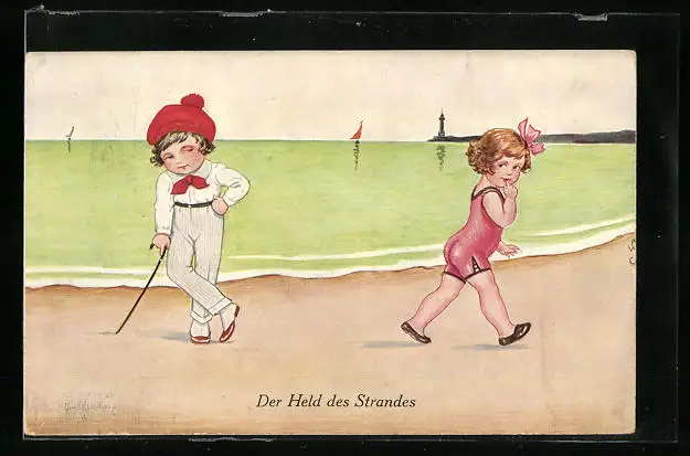 AK Junge schaut Mädchen in Bademode am Strand hinterher