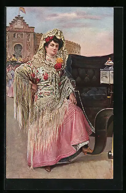 AK Junge spanische Dame in reicher Tracht an einer Kutsche