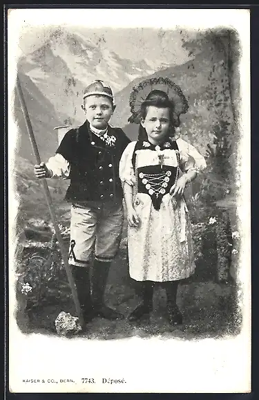 AK Junge und Mädchen in Schweiz Tracht mit Wanderstab