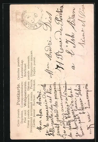 Personenbezogene Daten auf der Rückseite der Karte wurden durch blauen Textmarker unkenntlich gemacht. Die blauen Stellen sind auf die Vorderseite durchgeweicht und wirken sich negativ auf das Postkartenfoto aus