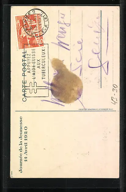 Personenbezogene Daten auf der Rückseite der Karte wurden durch blauen Textmarker unkenntlich gemacht. Die blauen Stellen sind auf die Vorderseite durchgeweicht und wirken sich negativ auf das Postkartenfoto aus