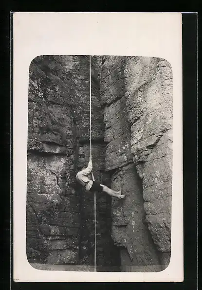 AK Junger Bergsteiger klettert mit einem Seil an einer Felswand