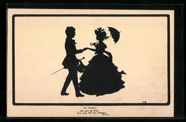 AK Junger Mann begrüsst die Spaziergängerin, Scherenschnitt