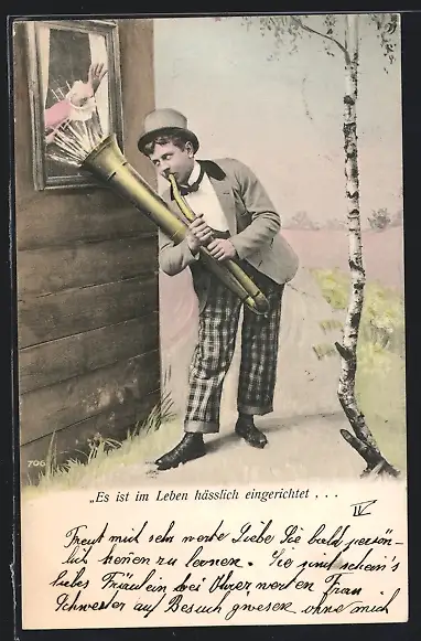 AK Junger Mann mit Blasinstrument am Fenster seiner Geliebten