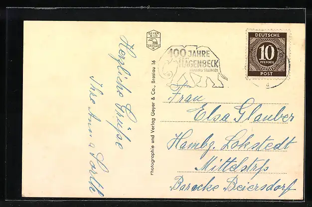 Personenbezogene Daten auf der Rückseite der Karte wurden durch blauen Textmarker unkenntlich gemacht. Die blauen Stellen sind auf die Vorderseite durchgeweicht und wirken sich negativ auf das Postkartenfoto aus