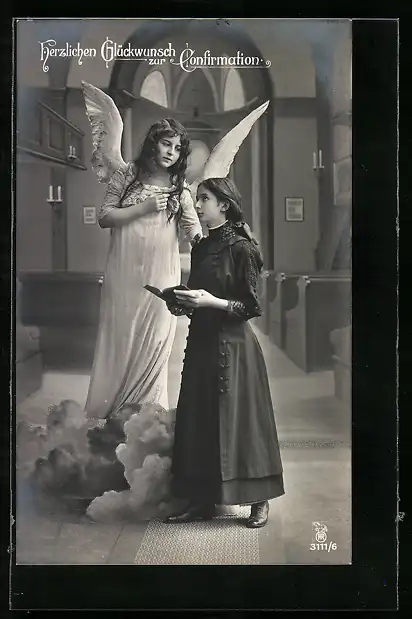 AK Junges Mädchen betet bei ihrer Konfirmation mit einem Engel