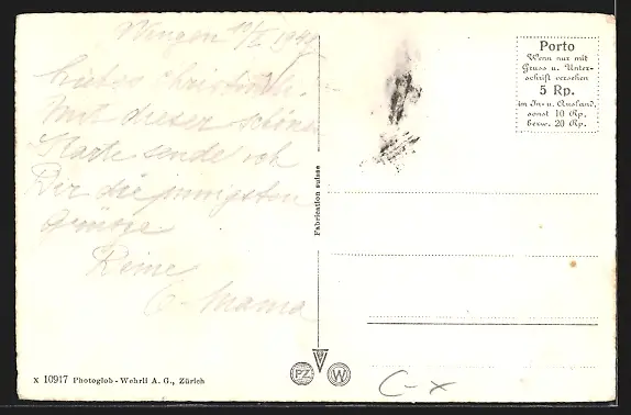 Personenbezogene Daten auf der Rückseite der Karte wurden durch blauen Textmarker unkenntlich gemacht. Die blauen Stellen sind auf die Vorderseite durchgeweicht und wirken sich negativ auf das Postkartenfoto aus
