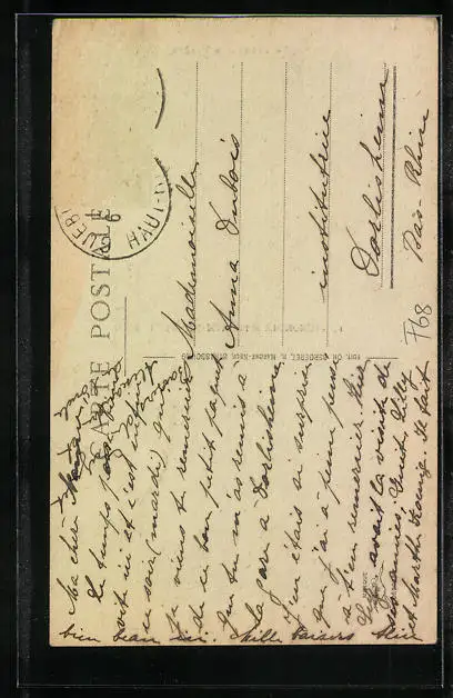 Personenbezogene Daten auf der Rückseite der Karte wurden durch blauen Textmarker unkenntlich gemacht. Die blauen Stellen sind auf die Vorderseite durchgeweicht und wirken sich negativ auf das Postkartenfoto aus