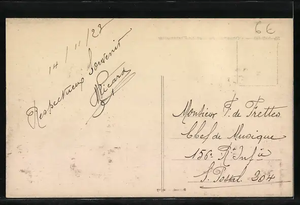 Personenbezogene Daten auf der Rückseite der Karte wurden durch blauen Textmarker unkenntlich gemacht. Die blauen Stellen sind auf die Vorderseite durchgeweicht und wirken sich negativ auf das Postkartenfoto aus