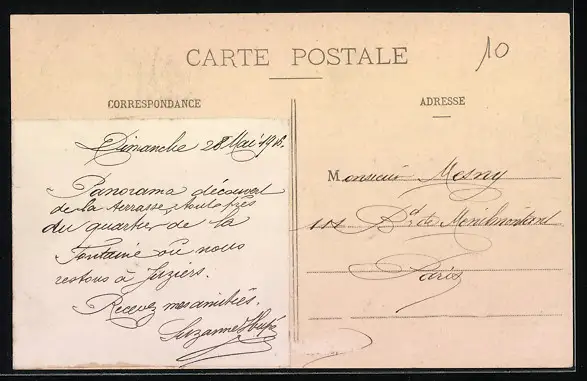 Personenbezogene Daten auf der Rückseite der Karte wurden durch blauen Textmarker unkenntlich gemacht. Die blauen Stellen sind auf die Vorderseite durchgeweicht und wirken sich negativ auf das Postkartenfoto aus