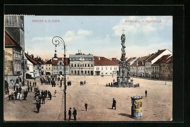AK Kaaden an der Eger, Ringplatz mit Pestsäule