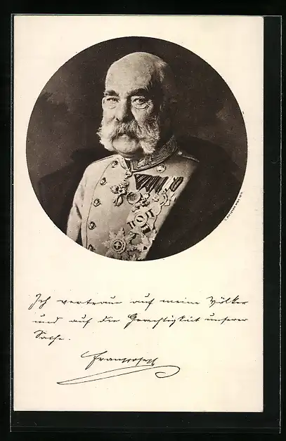 AK Kaiser Franz Josef I. von Österreich in Uniform mit Orden, Text