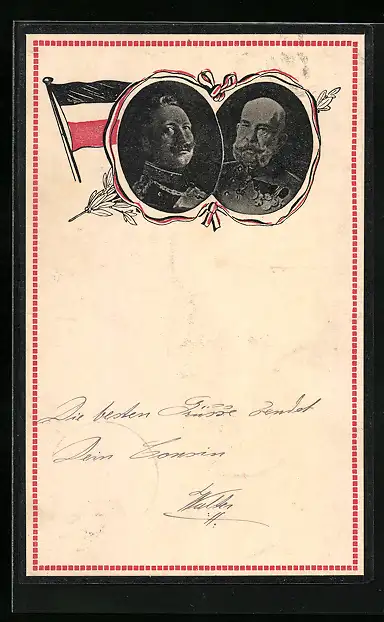 AK Kaiser Franz Josef I. von Österreich und Kaiser Wilhelm II., Reichsflagge