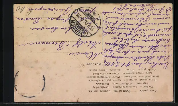 Personenbezogene Daten auf der Rückseite der Karte wurden durch blauen Textmarker unkenntlich gemacht. Die blauen Stellen sind auf die Vorderseite durchgeweicht und wirken sich negativ auf das Postkartenfoto aus