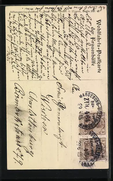Personenbezogene Daten auf der Rückseite der Karte wurden durch blauen Textmarker unkenntlich gemacht. Die blauen Stellen sind auf die Vorderseite durchgeweicht und wirken sich negativ auf das Postkartenfoto aus