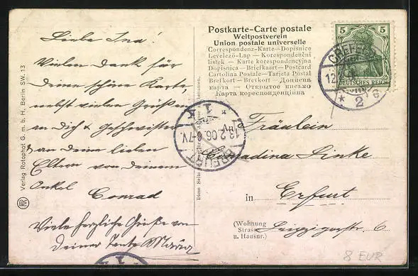 alte Ansichtskarte, gelaufen 1906, Eckknick oben re., guter Zustand