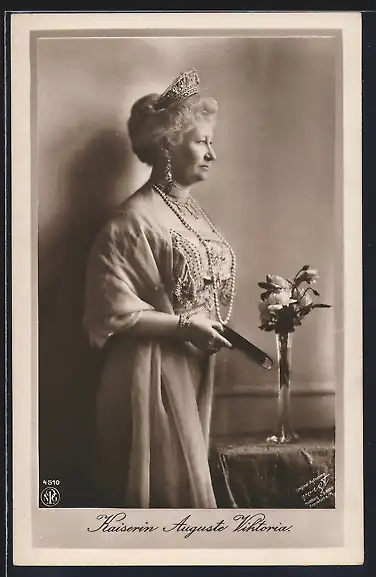AK Kaiserin Auguste Victoria von Preussen mit Perlenkette und Blumenvase