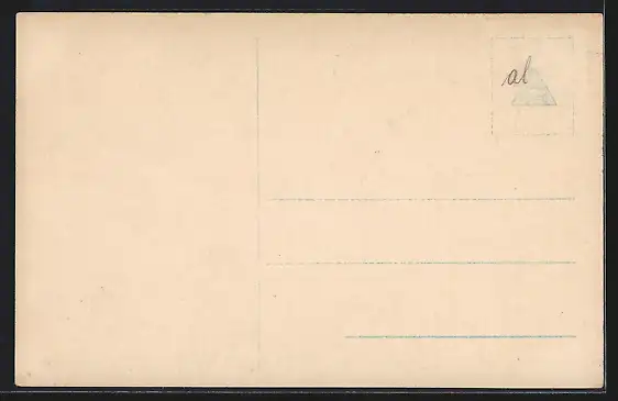 Personenbezogene Daten auf der Rückseite der Karte wurden durch blauen Textmarker unkenntlich gemacht. Die blauen Stellen sind auf die Vorderseite durchgeweicht und wirken sich negativ auf das Postkartenfoto aus
