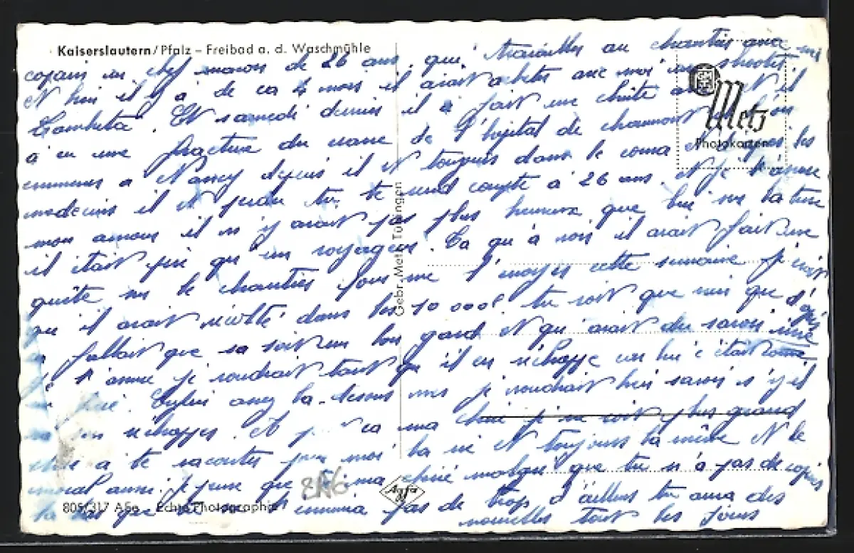 Personenbezogene Daten auf der Rückseite der Karte wurden durch blauen Textmarker unkenntlich gemacht. Die blauen Stellen sind auf die Vorderseite durchgeweicht und wirken sich negativ auf das Postkartenfoto aus