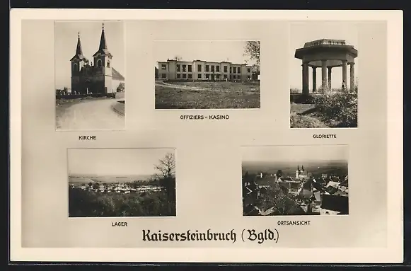 AK Kaisersteinbruch, Kirche, Offiziers-Kasino, Gloriette, Lager, Ortsansicht