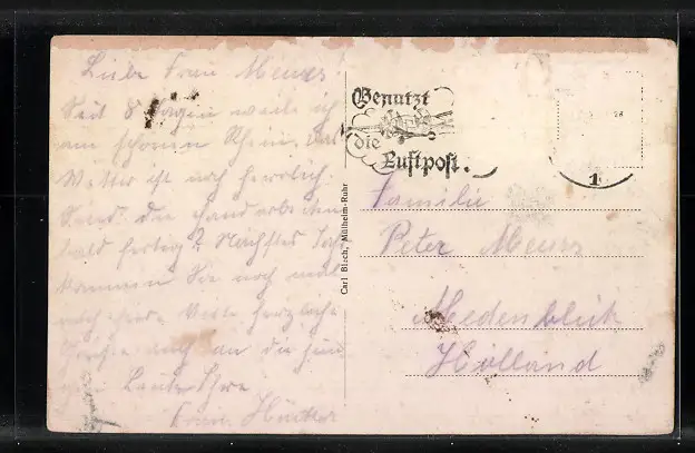 Personenbezogene Daten auf der Rückseite der Karte wurden durch blauen Textmarker unkenntlich gemacht. Die blauen Stellen sind auf die Vorderseite durchgeweicht und wirken sich negativ auf das Postkartenfoto aus