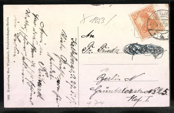 Personenbezogene Daten auf der Rückseite der Karte wurden durch blauen Textmarker unkenntlich gemacht. Die blauen Stellen sind auf die Vorderseite durchgeweicht und wirken sich negativ auf das Postkartenfoto aus