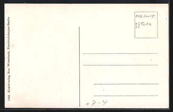 Personenbezogene Daten auf der Rückseite der Karte wurden durch blauen Textmarker unkenntlich gemacht. Die blauen Stellen sind auf die Vorderseite durchgeweicht und wirken sich negativ auf das Postkartenfoto aus
