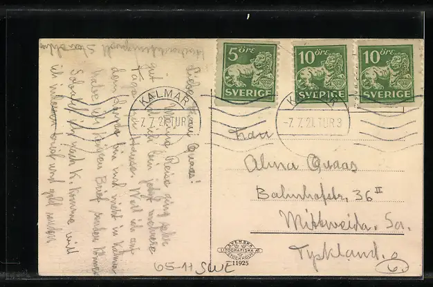 Personenbezogene Daten auf der Rückseite der Karte wurden durch blauen Textmarker unkenntlich gemacht. Die blauen Stellen sind auf die Vorderseite durchgeweicht und wirken sich negativ auf das Postkartenfoto aus