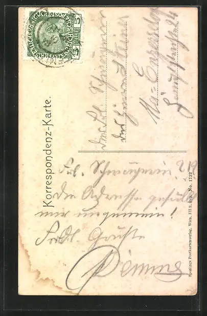Personenbezogene Daten auf der Rückseite der Karte wurden durch blauen Textmarker unkenntlich gemacht. Die blauen Stellen sind auf die Vorderseite durchgeweicht und wirken sich negativ auf das Postkartenfoto aus