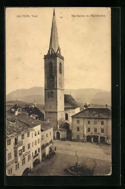 AK Kaltern, Marktplatz mit Pfarrkirche, Gasthof Mondschein