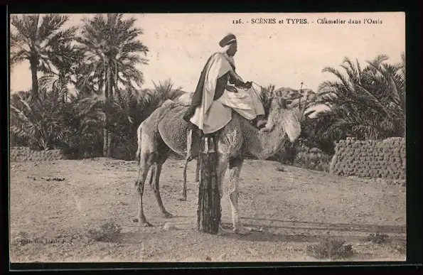 AK Kameltreiber auf seinem Kamel in einer Oase