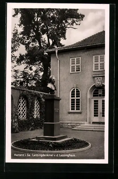 AK Kamenz /Sa., Lessingdenkmal vor dem Lessinghaus