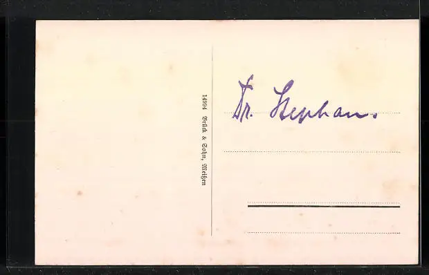 Personenbezogene Daten auf der Rückseite der Karte wurden durch blauen Textmarker unkenntlich gemacht. Die blauen Stellen sind auf die Vorderseite durchgeweicht und wirken sich negativ auf das Postkartenfoto aus