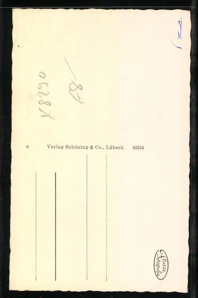 Personenbezogene Daten auf der Rückseite der Karte wurden durch blauen Textmarker unkenntlich gemacht. Die blauen Stellen sind auf die Vorderseite durchgeweicht und wirken sich negativ auf das Postkartenfoto aus