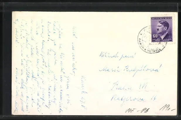 Personenbezogene Daten auf der Rückseite der Karte wurden durch blauen Textmarker unkenntlich gemacht. Die blauen Stellen sind auf die Vorderseite durchgeweicht und wirken sich negativ auf das Postkartenfoto aus