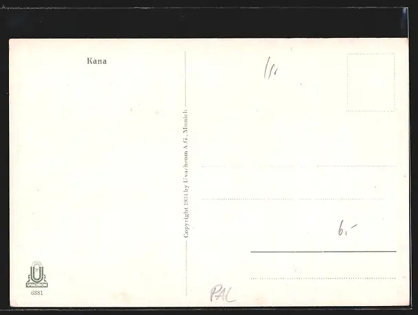 Personenbezogene Daten auf der Rückseite der Karte wurden durch blauen Textmarker unkenntlich gemacht. Die blauen Stellen sind auf die Vorderseite durchgeweicht und wirken sich negativ auf das Postkartenfoto aus
