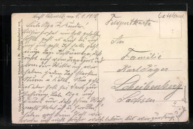 Personenbezogene Daten auf der Rückseite der Karte wurden durch blauen Textmarker unkenntlich gemacht. Die blauen Stellen sind auf die Vorderseite durchgeweicht und wirken sich negativ auf das Postkartenfoto aus
