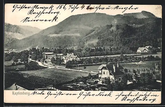 AK Kapfenberg, Ortspartie mit Bergpanorama aus der Vogelschau