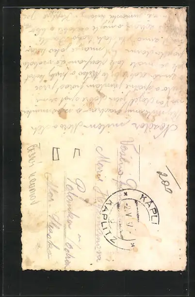 Personenbezogene Daten auf der Rückseite der Karte wurden durch blauen Textmarker unkenntlich gemacht. Die blauen Stellen sind auf die Vorderseite durchgeweicht und wirken sich negativ auf das Postkartenfoto aus