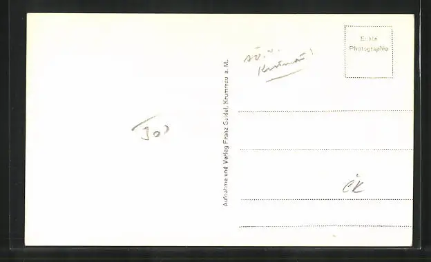 Personenbezogene Daten auf der Rückseite der Karte wurden durch blauen Textmarker unkenntlich gemacht. Die blauen Stellen sind auf die Vorderseite durchgeweicht und wirken sich negativ auf das Postkartenfoto aus