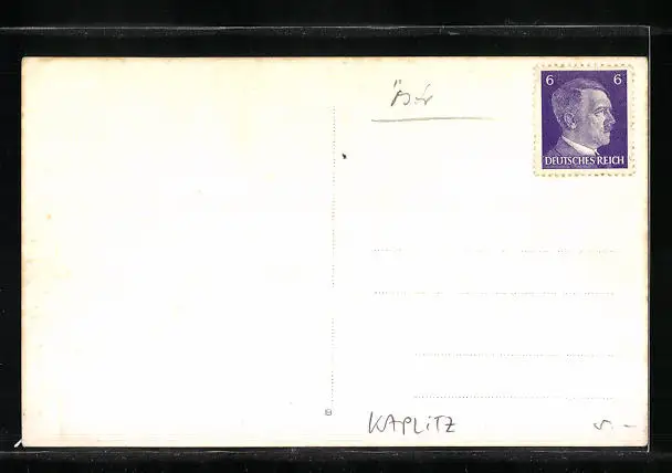 Personenbezogene Daten auf der Rückseite der Karte wurden durch blauen Textmarker unkenntlich gemacht. Die blauen Stellen sind auf die Vorderseite durchgeweicht und wirken sich negativ auf das Postkartenfoto aus