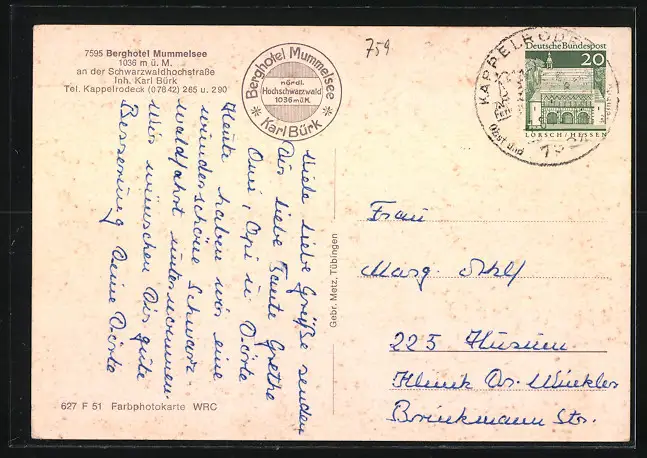 Personenbezogene Daten auf der Rückseite der Karte wurden durch blauen Textmarker unkenntlich gemacht. Die blauen Stellen sind auf die Vorderseite durchgeweicht und wirken sich negativ auf das Postkartenfoto aus