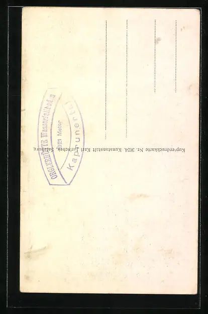 Personenbezogene Daten auf der Rückseite der Karte wurden durch blauen Textmarker unkenntlich gemacht. Die blauen Stellen sind auf die Vorderseite durchgeweicht und wirken sich negativ auf das Postkartenfoto aus
