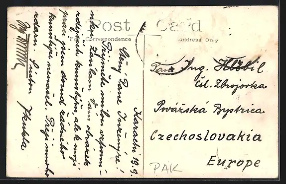 Personenbezogene Daten auf der Rückseite der Karte wurden durch blauen Textmarker unkenntlich gemacht. Die blauen Stellen sind auf die Vorderseite durchgeweicht und wirken sich negativ auf das Postkartenfoto aus