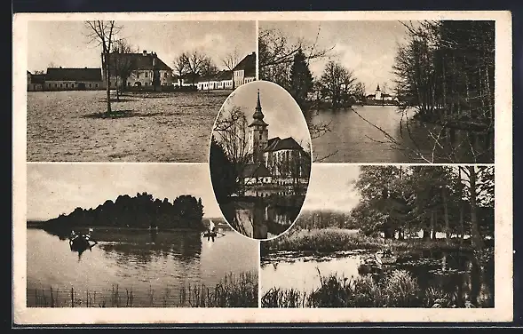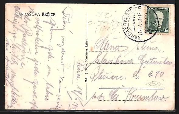 AK Kardasova Recice, Blick zur Kirche, Ortspartie, Flusspartien