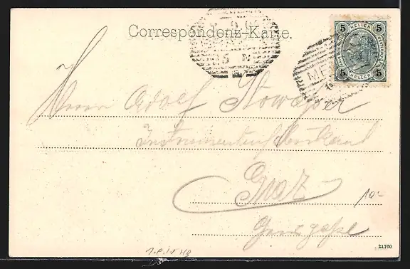 Personenbezogene Daten auf der Rückseite der Karte wurden durch blauen Textmarker unkenntlich gemacht. Die blauen Stellen sind auf die Vorderseite durchgeweicht und wirken sich negativ auf das Postkartenfoto aus